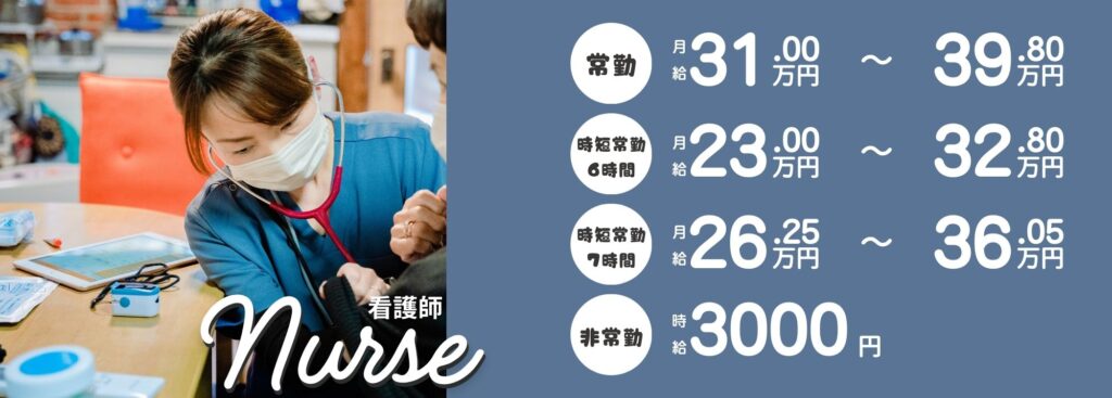 | 休日 | 月8日+当月の祝日分代休、常勤看護師特別休暇、夏休み3日間、冬休み3日間(年127日程度) |